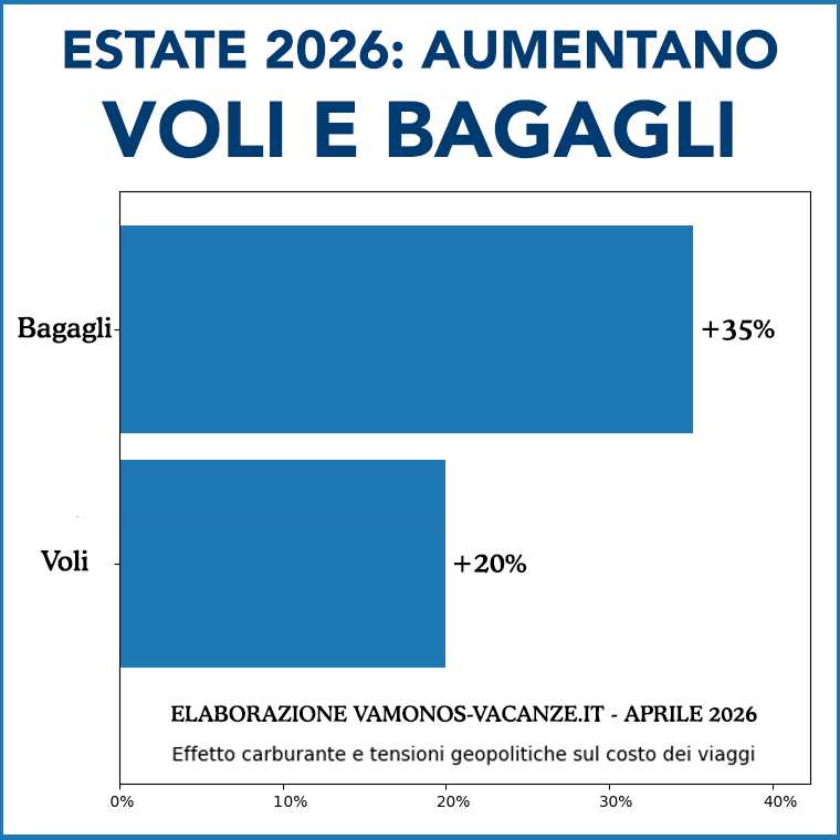L’estate 2026 si preannuncia più costosa per chi viaggia. Non solo per i biglietti aerei, ma anche per i servizi accessori come i bagagli, sempre più spesso soggetti a rincari. «A pesare è soprattutto l’aumento del costo del carburante, legato alle tensioni geopolitiche in Medio Oriente, che sta già spingendo le compagnie aeree a rivedere i listini» spiegano gli analisti di Vamonos Vacanze, tour operator specializzato in vacanze di gruppo.