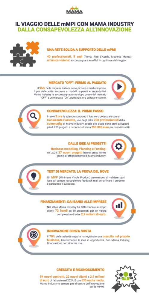 Mama Industry (e la startup collegata Mama Innovation) segue oggi un portfolio di circa 300 clienti, che sono accompagnati in questo viaggio grazie a un team di 40 dipendenti (cresciuto nel 2024 con l’assunzione di 16 nuove risorse), distribuiti in 5 sedi sul territorio italiano (Roma, Rieti, L’Aquila, Modena e Monza) e organizzato in business unit che lavorano in modo integrato e sinergico per coprire ogni aspetto e ogni fase del percorso dei clienti: dalla consulenza alla progettazione del cambiamento, dalla partecipazione ai bandi pubblici per il finanziamento dei progetti, fino al loro sviluppo, passando per la consulenza per il  recruiting delle risorse umane fino agli aspetti di marketing e comunicazione e di primo test sul mercato.