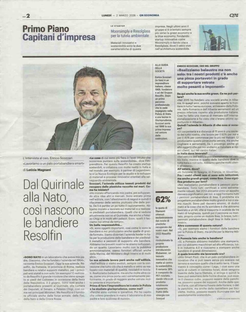 Roma, 04 marzo 2026 — Tre pagine intere, inclusa la prima pagina. Il dorso economico nazionale di QN ECONOMIA —supplemento del circuito Il Giorno, Il Resto del Carlino e La Nazione— ha dedicato un ampio speciale a Resolfin, Resolglass e al percorso imprenditoriale del CEO Enrico Scozzari.