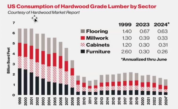 L’industria del legno di latifoglia americano sta affrontando un periodo di incertezze, con un calo significativo della produzione sia di legno di qualità che industriale, scesa da 16.88 milioni di metri cubi nel 2022 a meno di 12 milioni nel 2024, minimo storico. A fronte di una domanda interna in diminuzione per il legno di qualità e di un panorama produttivo in calo, l’attenzione verso i mercati esteri e la gestione sostenibile delle foreste diventano temi sempre più cruciali.